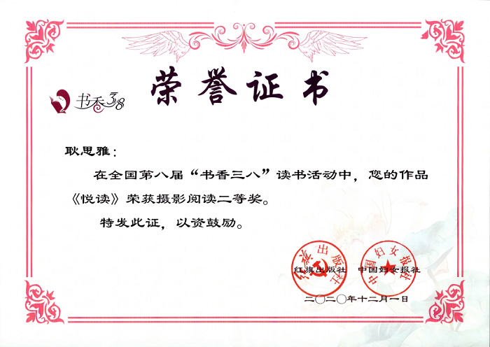 近日,由红旗出版社、中国妇女报社联合主办的第八届“书香三八”读书活动评选结果已揭晓,色情网站 党委宣传部耿思雅老师的摄影类作品《悦读》喜获二等奖。