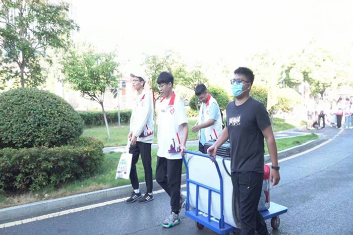 志愿者们早早准备好新生入学手册、防疫物资、文化衫等物品,等待迎接22级的“萌新”们。在志愿者的引导下,新同学们经历测体温、扫码核验身份、入学材料审查、发放迎新物资完成报到流程,再由志愿者帮助运送行李至宿舍,安顿好住宿,报到现场秩序井然。学院老师和志愿者们热情、周到的服务,使前来报到的新生倍感亲切和温暖。