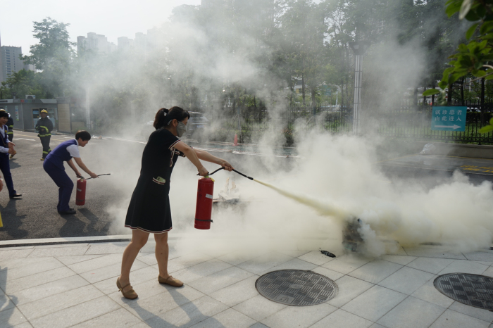 消防演练环节,各科室医护人员、行政后勤人员,以及保洁、安保等第三方工作人员全神贯注地投入到灭火器实操学习中。消防专家手持干粉灭火器,分解演示“提、拔、握、压”四步操作要领。大家熟练掌握着灭火器这一“生命安全武器”,为后续消防演练筑牢实操基础。