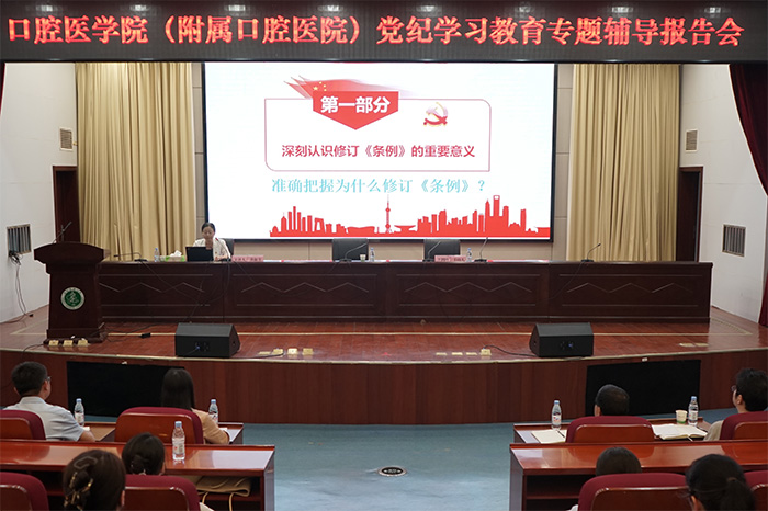 黄新美从深刻认识《条例》修订的重要意义、准确理解《条例》修订的主要内容、学校纪检监察工作实践和认真抓好《条例》贯彻执行四个方面,对如何抓好《条例》贯彻执行、深化党纪学习教育进行阐述。她还结合近年学校及直属附属医院纪检监察机构查处的典型案例,对《条例》中关于“六项纪律”新修订的内容细节进行剖析,用身边事教育身边人,教育引导党员干部进一步强化纪律意识,加强自我约束,提高免疫能力,不断涵养忠诚干净担当的政治品格,不断凝聚干事创业的强大合力。