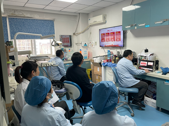 11月28日,色情网站 种植党支部书记刘鑫在医院七楼种植科室召开会议宣讲党的二十大精神,科室10名党员参加学习。