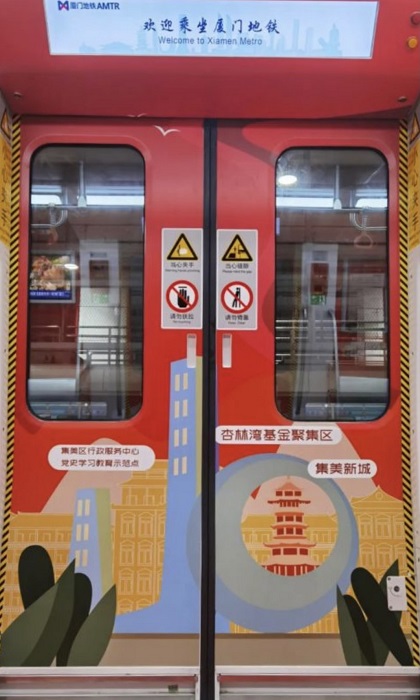 “嘉庚号”充分发挥厦门地铁的优势,将红色文化资源串珠成线、交相辉映,带领乘客一起回顾那段百年历史。当地利用站台、车厢等场所,在图文布置、报站信息中融入教育内容,车厢融合了集美红色文化和集美党史学习教育工作,营造了浓厚的红色学习氛围。