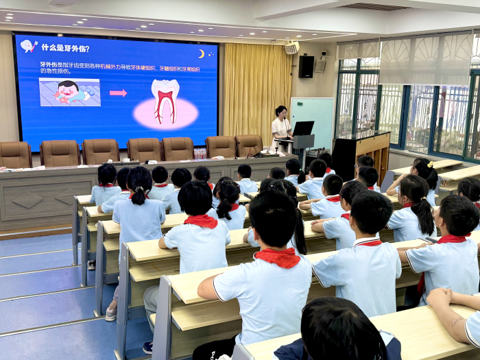 围绕儿童牙外伤发病率升高趋势,口腔宣教重点介绍了儿童牙外伤的预防和治疗;此外,为进一步提高小学生们的口腔健康保健意识,帮助他们养成良好的口腔卫生习惯,重点介绍了牙线的使用方法。活动现场,20222级硕士研究生陆肖璇通过讲座、互动问答、模拟演示等多种形式,让孩子们在轻松愉快的氛围中掌握了口腔保健的基本方法。