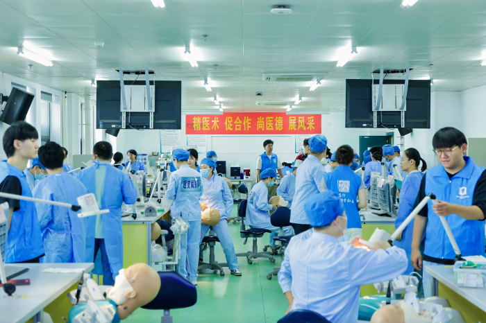在心肺复苏赛道上,参赛选手准确而迅速地进行急救操作,体现了临床救治中的应变能力和技术水平。橡皮障的使用和二类洞制备考察了选手的配合和牙体预备的基本功。口内缝合术则是对手术后切口缝合的基本技能比拼。磨牙全瓷冠牙体预备赛道上,选手们展示了他们在修复牙体上的精准度和耐心。龈上洁治术赛道强调了对口腔卫生的维护以及预防疾病的重要性。临床病例汇报不仅考察了选手的临床思维能力,也考验了他们在临床诊疗中的沟通和表达能力。比赛使用口腔OSCE在线考核平台和机器扫描系统进行评分,为参赛者的表现进行专业、客观的评估,同时设置现场观摩区和图片直播。