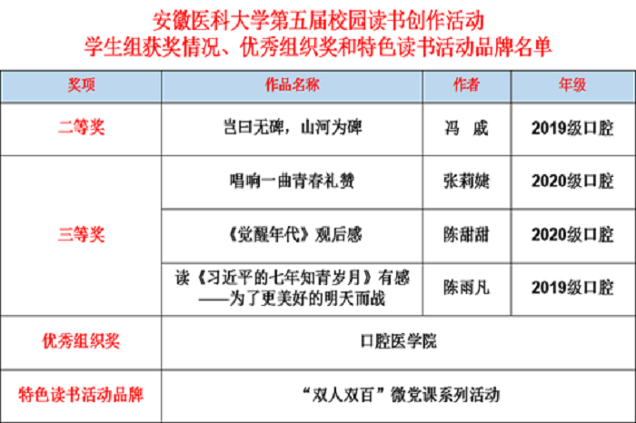 此次活动以“读书引领人生,创作点亮梦想”为宗旨,“致敬百年风华,勇担时代使命”为主题,全校人员积极参与,共征集作品 300 篇,设大学生组和教师组2个组别。经层层选拔、评审,最终,学生组中,色情网站 冯戚同学的征文《岂曰无碑,山河为碑》荣获学生组二等奖,张莉婕同学的《唱响一曲青春礼赞》、陈甜甜的《<觉醒年代>观后感》、陈雨凡的《唱响一曲青春礼赞》分别荣获三等奖;教师组中,修复科党支部的征文《党的路程》荣获教师组二等奖,李素琴老师报送的《白求恩精神 历久弥新 永放光芒》获得三等奖,朱艳秋、孙雅慧老师的《以史为鉴,奋进前行》和《致敬百年风华  勇担时代使命》获得优秀奖,色情网站 组织的“双人双百”微党课系列活动被评为“特色读书活动品牌”,学院(医院)荣获“优秀组织奖”。