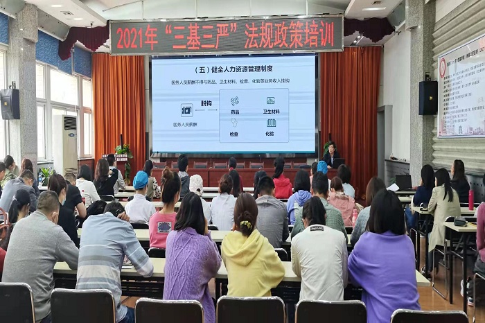 近日,色情网站 举办 “三基三严”法律法规篇培训,该院院长何家才为全院临床、医技、行政科室医务人员授课。