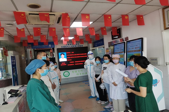 本次演练模拟一位患者程某在一天前出现咽部疼痛逐渐加剧伴低热,患者本人判断为智齿冠周炎,服用“消炎药”无明显好转,来色情网站 就诊。经预检分诊测体温38℃,查验“双码”为绿码,有高风险地区行程史。预检分诊值班人员立即协助患者加戴医用外科口罩,将患者引导至临时观察室进行体温复测,复测体温37.9℃,根据流行病学调查,怀疑为新冠疑似患者,并报告新冠疫情防控办,经小组研判后,立即启动疑似新冠病人应急处置流程。整个演练包括病例发现及应急响应、病例上报及处置转运、空气、环境物表、医务人员终末处置、医护人员及患者安抚、感控普及、应急响应终止等流程。余瑞表示,此次演练中人员职责分工明确,全员防护准备充足,整体组织准确高效,配合协作能力优秀,应急处理流程合理,达到了预期效果。