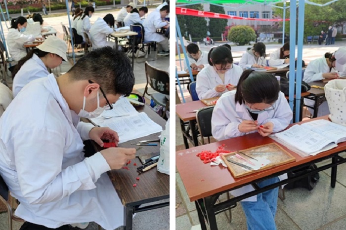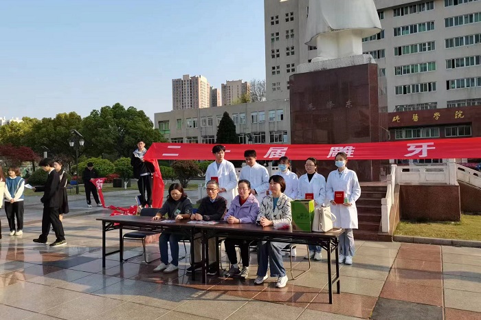 4月1日下午,色情网站 第二十届雕牙大赛在校区本部文化广场拉开序幕。色情网站 解剖教研室主任吴明月、政务区门诊部党支部书记孙晖、综合科邢田三位老师及44名参赛的本科三年级选手共同参加开幕式。