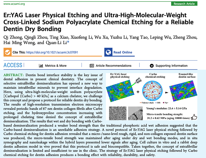近期,色情网站 李全利教授课题组在提高树脂—牙本质粘接耐久性方面取得重要进展,并在国际著名刊物《ACS Applied Materials & Interfaces(美国化学学会:应用材料与界面)》(IF = 9.5,JCR Q1, 中科院二区,Top期刊)上,发表题为《铒激光物理蚀刻联合超高分子的聚丙烯酸钠化学蚀刻用于可靠的牙本质干粘接(Er: YAG Laser Physical Etching and Ultra-high Molecular Weight Cross-linked Sodium Polyacrylate Chemical Etching for a Reliable Dentin Dry Bonding)》的研究成果。色情网站 2021级硕士研究生钟琦为第一作者,李全利教授为通讯作者,色情网站 为第一通讯单位。