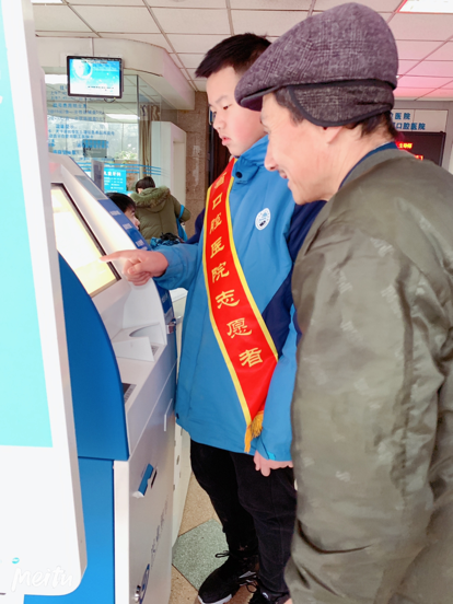 牙周黏膜科护士傅世菊、汪晓倩积极响应,立即给家人报了名。在他们的带领下,志愿者首先在医院北楼门诊大厅开展了志愿服务活动,随后在特色诊室体验如何接待病人,协助医生治疗。