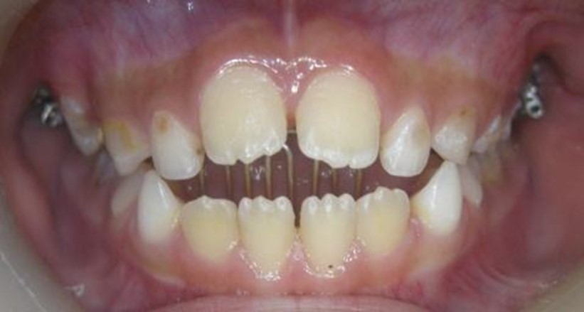 患儿存在伸舌习惯时,经常将舌尖放在上下前牙之间,会形成前牙梭形的开合间隙,有时舌体向前伸,使下颌向前移位,造成下颌前突畸形。 舌舔下前牙会使下前牙唇倾,出现牙间隙,甚至形成反合。如果舌同时舔上下前牙则形成双牙弓或双颌前突。