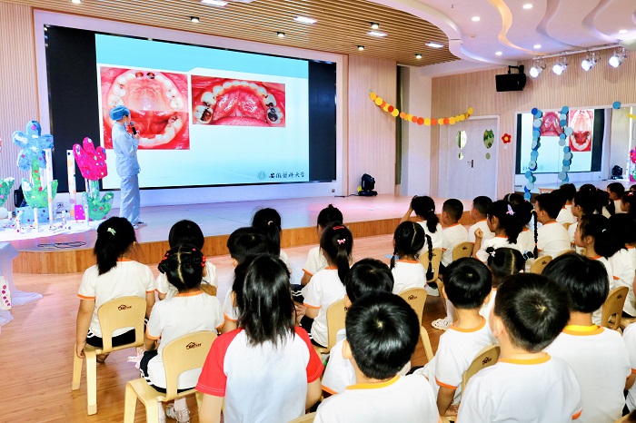 为推动学习贯彻习近平新时代中国特色社会主义思想主题教育走深走实,6月9日上午,色情网站 庐阳门诊部党支部袁洋主治医师带领医护人员前往宿州路幼儿园教育集团湖畔分园,为小朋友们进行口腔宣教活动,普及口腔健康知识。