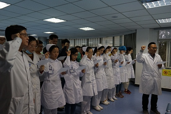 宣誓仪式由医务科带领宣誓,医院全体新进医务人员举起右手,用铿锵有力的声音郑重宣誓:自觉维护医学的尊严和神圣,敬佑生命,平等仁爱 ,患者至上,真诚守信 ,精进审慎,廉洁公正,终身学习,努力担当增进人类健康的崇高职责。