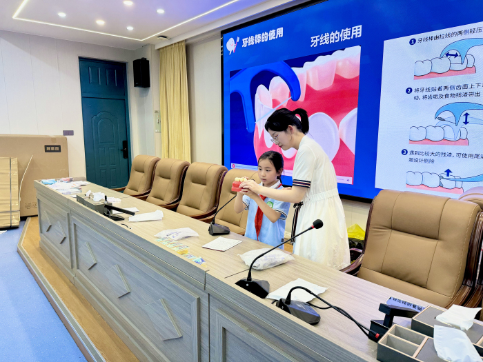 围绕儿童牙外伤发病率升高趋势,口腔宣教重点介绍了儿童牙外伤的预防和治疗;此外,为进一步提高小学生们的口腔健康保健意识,帮助他们养成良好的口腔卫生习惯,重点介绍了牙线的使用方法。活动现场,20222级硕士研究生陆肖璇通过讲座、互动问答、模拟演示等多种形式,让孩子们在轻松愉快的氛围中掌握了口腔保健的基本方法。