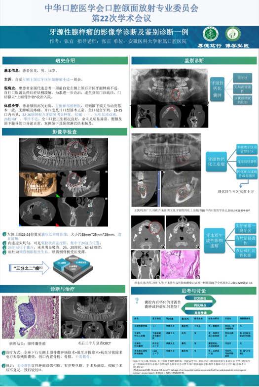 会上,色情网站 放射科团队展示了壁报《牙源性腺样瘤的影像学诊断及鉴别诊断一例》和《多骨性骨纤维异常增殖症一例》。前者展示了较为典型的牙源性腺样瘤,通过其影像学表现、诊断与治疗过程,同具有相似影像表现的牙源性钙化囊肿、牙源性钙化上皮瘤及牙本质生成性影细胞瘤等作出了详细的鉴别诊断说明。后者通过多骨性骨纤维异常增殖症的影像学检查,介绍了骨纤维异常增殖症的不同影像学特征;并与骨囊肿、骨巨细胞瘤、非骨化性纤维瘤等作出了详细的鉴别诊断说明。两幅壁报的展示赢得了与会专家的高度认可和广泛赞誉,分别获得三等奖、优秀奖。